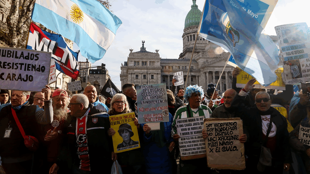 Un cordón policial rodeó un a un grupo pequeño de jubilados que mostraban carteles como protesta. «No tenemos piedras ni palos, ¿por qué nos tratan así?», señaló uno de ellos.