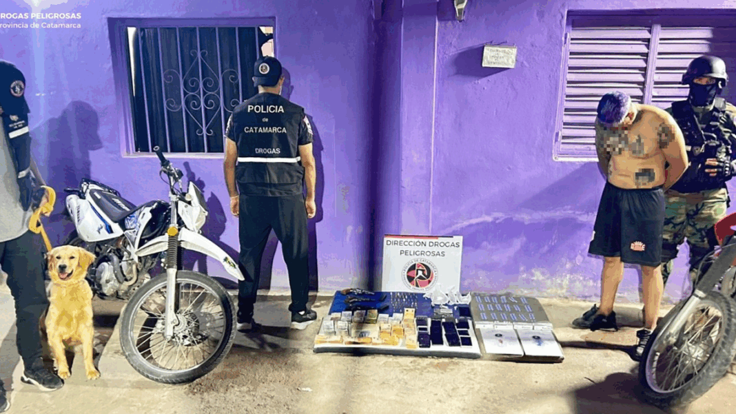 Tras una medida Judicial contra el narcomenudeo en Valle Viejo policías secuestraron más de 4 millones de pesos, motos, teléfonos celulares, armas de fuego, drogas y detienen a una persona. En la tarde de hoy, tras una ardua y minuciosa tarea investigativa, bajo las directivas del Juzgado Federal, personal de la Dirección Drogas Peligrosas de la Policía de la Provincia materializó un allanamiento en un domicilio del barrio 40 viviendas, de la localidad de Polcos, Dpto. Valle Viejo.